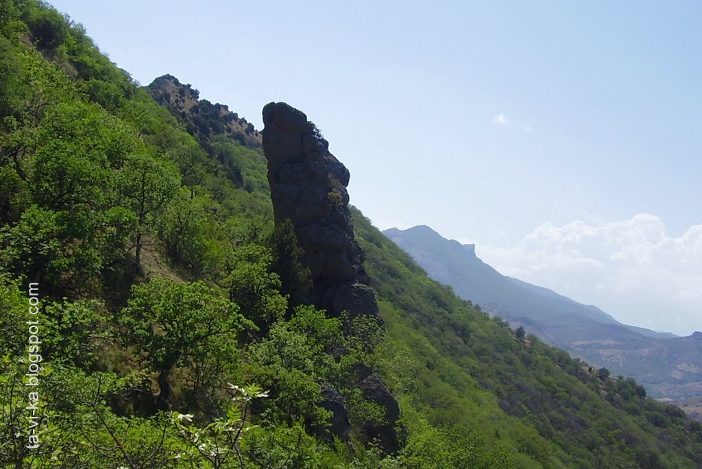 | Такие вот одиночные скалы называют "чертовы пальцы". Они стоят по всему склону горы |