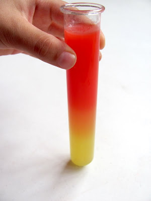 Приготовьте в одном из сосудов сахарный сироп (в 50 г горячей воды растворите 6-7 чайных ложек сахарного песка). Добавьте в сироп краситель и перемешайте до однородного состояния. Налейте в новый сосуд на треть получившийся сироп, а потом осторожно, стараясь не взбалтывать, добавьте туда столько же подкрашенной воды, приготовленной в предыдущем опыте. Обратите внимание малыша, что жидкости полностью не перемешались. Внизу остался чистый цвет, который был у сиропа, вверху - чистый цвет, который был у воды. А вот на границе этих двух жидкостей получился плавный переход одного цвета в другой. Наше зелье стало выглядеть по-настоящему волшебно.