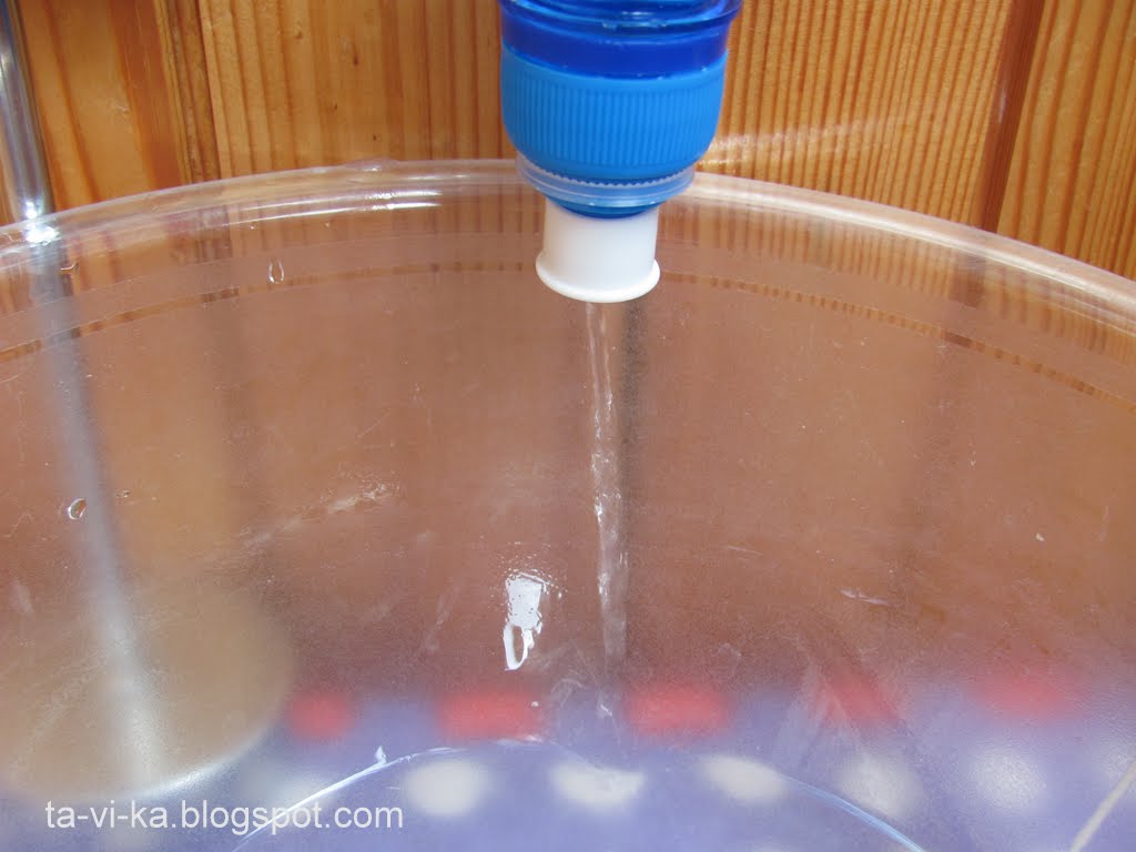 Под бутылкой снизу нужно подставить большую емкость для вытекающей воды.